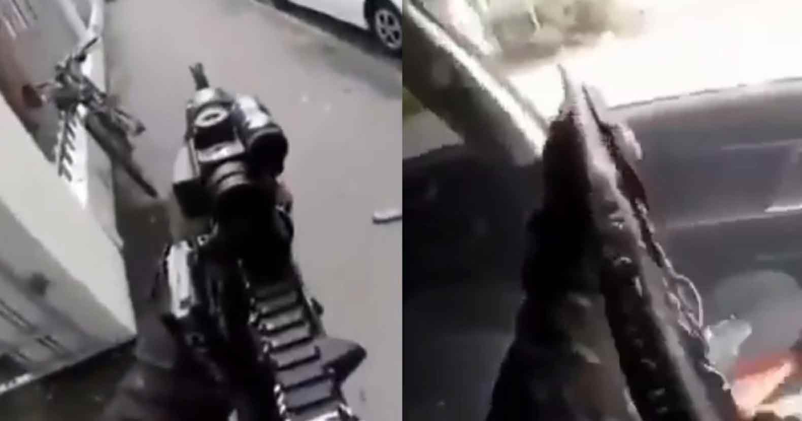 The man then puts the weapon back in the trunk of the vehicle and begins driving away. He laughs a few times, pulls out a shotgun, and starts firing at other vehicles and bystanders through the windshield and the side window.