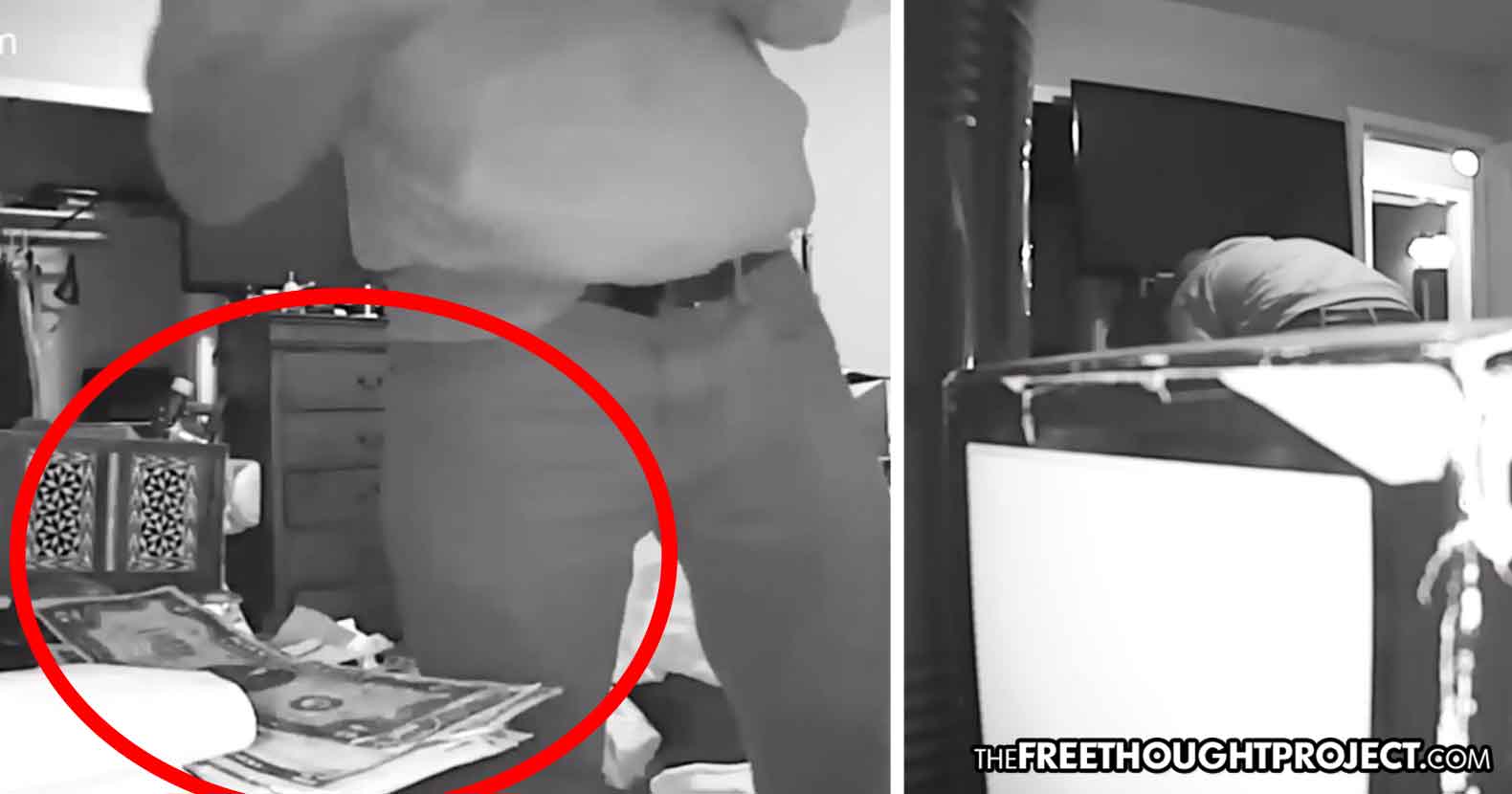 As the video shows, the officer is in the room by himself, as he looks around. When he spots the cash, instead of seizing it in an evidence bag, the cop shoves it in his sock.