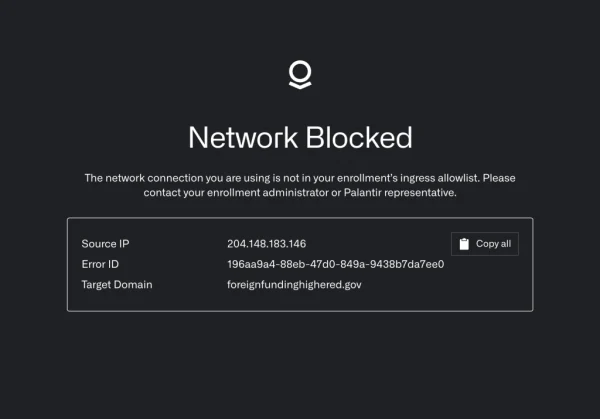 When FedScoop visited the link shortly before 10:30 a.m. ET on Thursday, the website showed a blocked network alert, which read, “The network connection you are using is not in your enrollment’s ingress allowlist. Please contact your enrollment administrator or Palantir representative.”