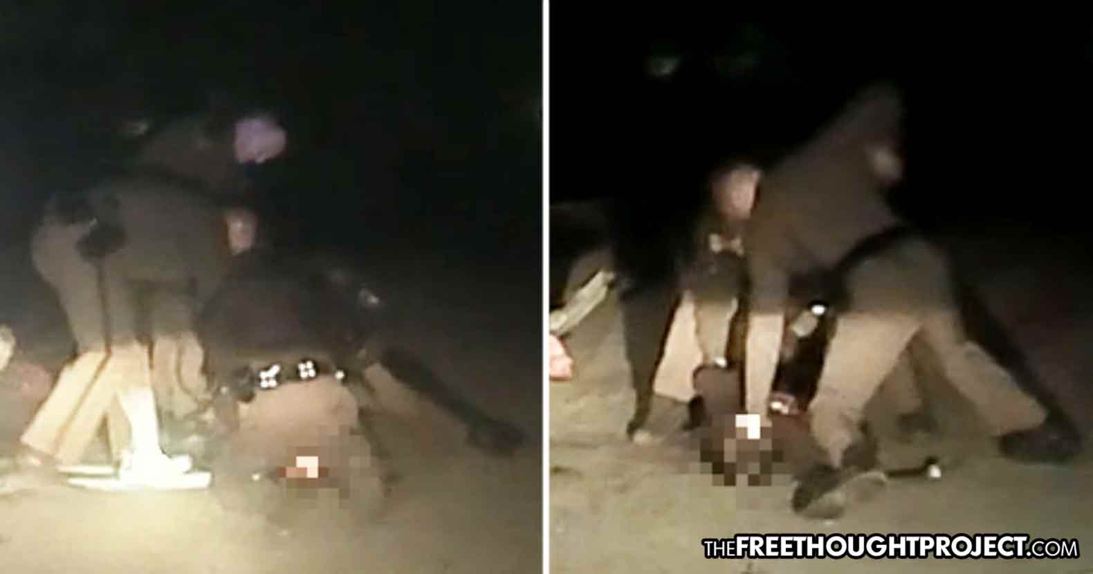 After he's ripped from the car and slammed face first into the pavement, as the teen's body lay limp on the ground, he is immediately placed in handcuffs. Then, for several moments the officers begin kicking, stomping, and punching his unresponsive body.
