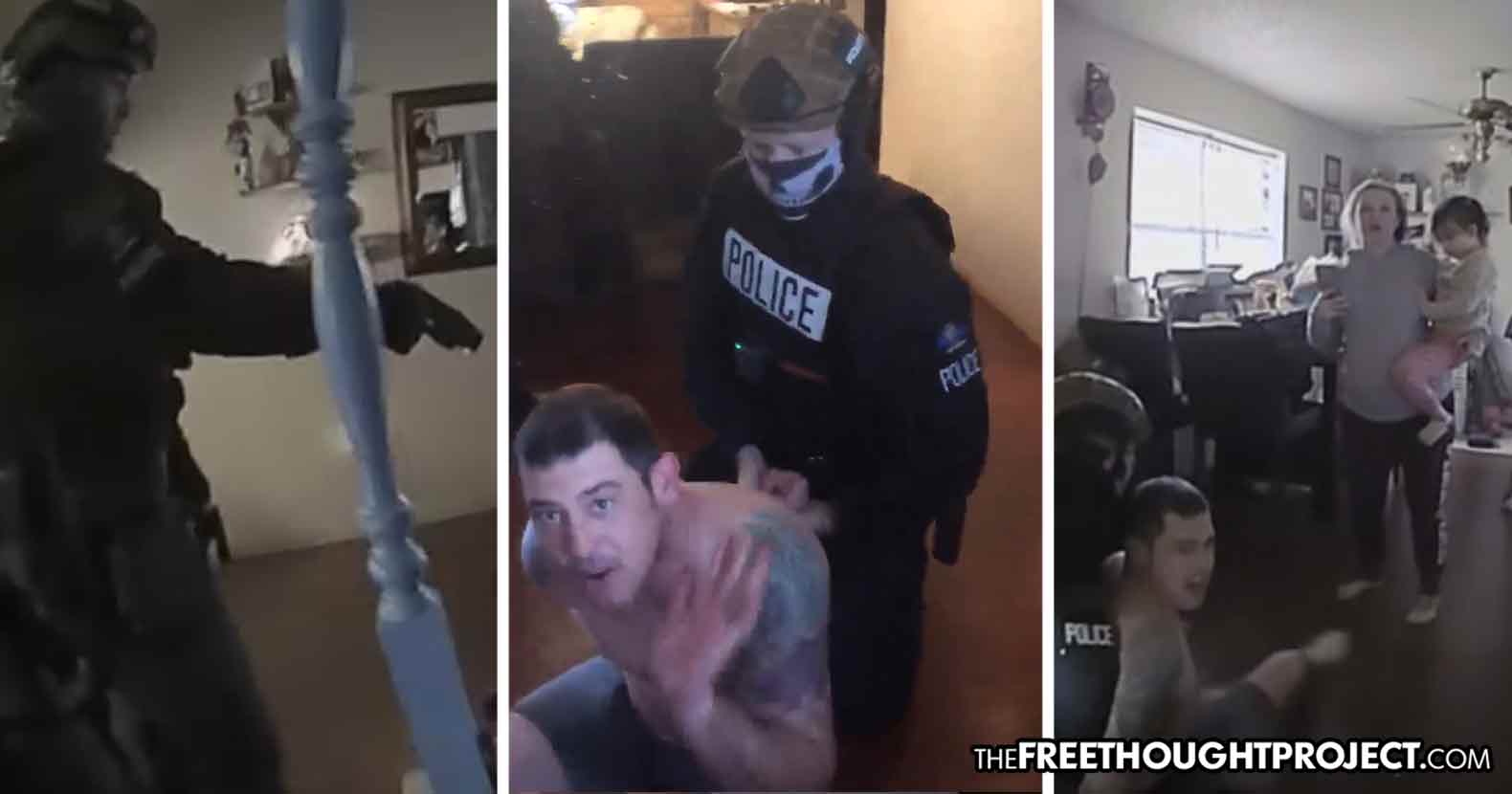 As the video begins, Baker is sitting on the ground in his underwear. All the officers are armed with AR-15s which, according to Baker, were pointed at his child's face, leaving her traumatized.