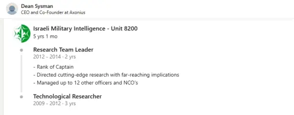 Axonius was founded and is currently run by Israelis Dean Sysman, Ofri Shur and Avidor Bartov, who met in the 2010s while working on the same team within Israel’s Unit 8200 spy service. On his LinkedIn profile, Sysman offers few details of their work for the IDF, describing it simply as having ‘far-reaching implications.’