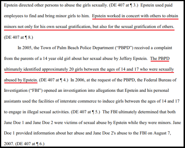 Background facts from 2/21/2019 ruling in Jane Doe 1 and Jane Doe 2 vs. United StatesThe sealed records appeal relates to a 2015 defamation lawsuit in New York brought by Epstein victim Virginia Roberts Giuffre against British socialite Ghislaine Maxwell. Giuffre says Maxwell helped Epstein traffic herself and other underage girls to sex parties at the billionaire pedophile's many residences. The case was settled in 2017 and the records were sealed - leading to an appeal by the Miami Herald and several other parties seeking to make them public in the hopes of shedding more light on the scope of Epstein's crimes - along with determining who else was involved and whether any undue influence tainted the case.