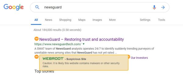 Ironically enough, while searching for the link to Newsguard on Google, using our Webroot spyware extension for Chrome, their website comes up with a warning that it likely contains malware or other security risks. An ominous indicator indeed.