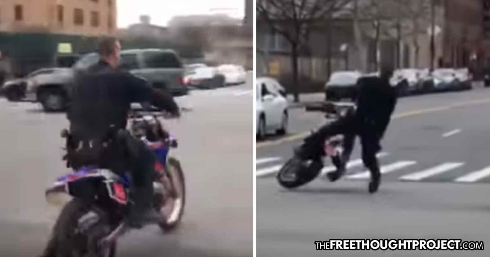 The embarrassing incident took place at roughly 6pm local time Sunday at the corner of Lenox Avenue and 135th Street in Harlem. Police had responded to reports of a man riding a dirt bike recklessly through traffic. The officer tasked with retrieving the suspect’s abandoned motorbike inadvertently outdid the wanted man, it seems.