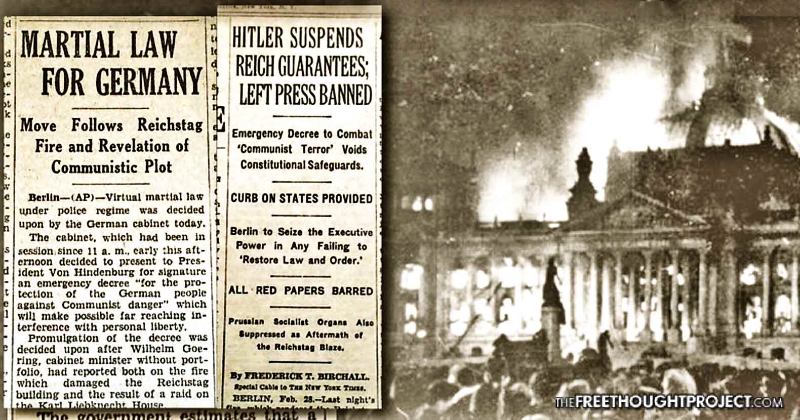 On this date, 87 years ago, the headquarters for the German parliament, known as the Reichstag building, was burned down due to arson. Immediately after the fires, the Nazis passed a piece of tyrannical legislation called the “decree for the protection of state and people," which gave them total police state control over the population.
