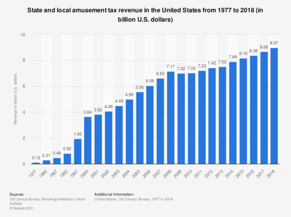 By 1997, amusement tax revenue had increased more than tenfold to nearly $1.95 billion, according to the data website Statista. Less than a decade later, the figure had tripled to more than $6 billion nationwide (see graph below).