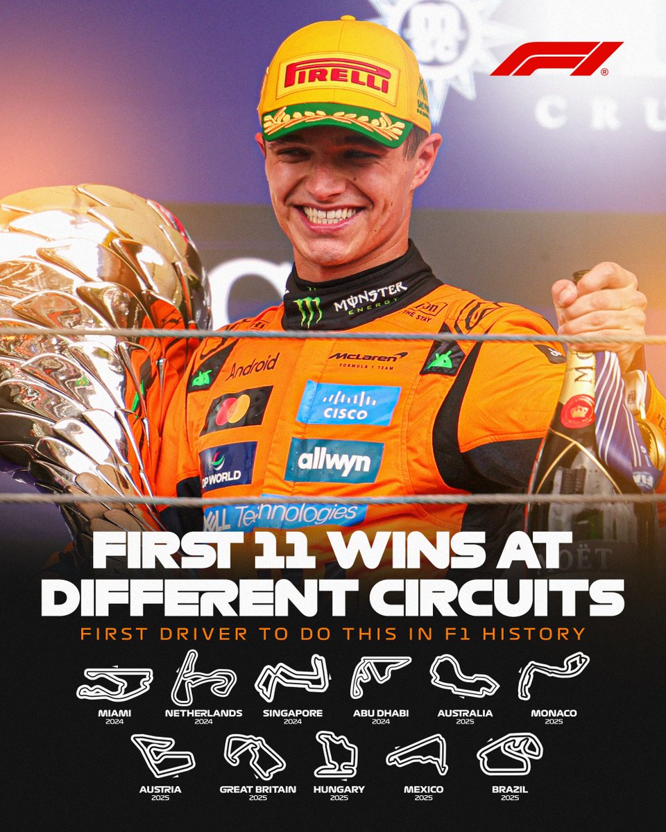 Congrats Lando! A huge feat, and a job well done. Norris is the first driver in Formula One History to in get first 11 wins at 11 different circuits. Formula 1 (@F1) on X [https://pbs.twimg.com/media/G5ts17-XIAAx_Y0.jpg:large] Formula 1 (@F1) on X Bravo, Lando! 💨 Our championship leader has secured each of his first 11 wins at 11 different circuits 🤯 #F1 [https://x.com/F1/status/1989365456948617697?s=20]
