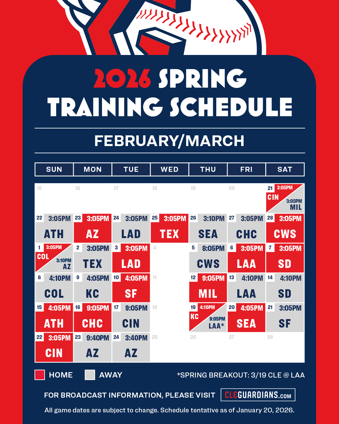 The Cleveland Guardians will begin their 2026 Spring Training action with a split-squad outing, with half the group taking on the Cincinnati Reds and the other half facing the Milwaukee Brewers on February 21.