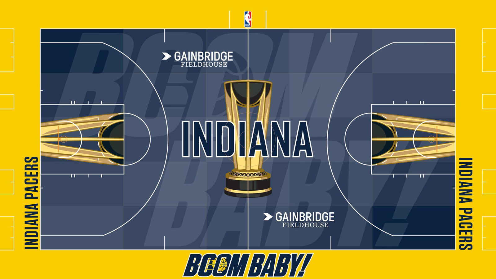 A key detail: “Boom Baby!” — the iconic phrase of the late Slick Leonard — is featured both along the baseline and in large letters across midcourt.