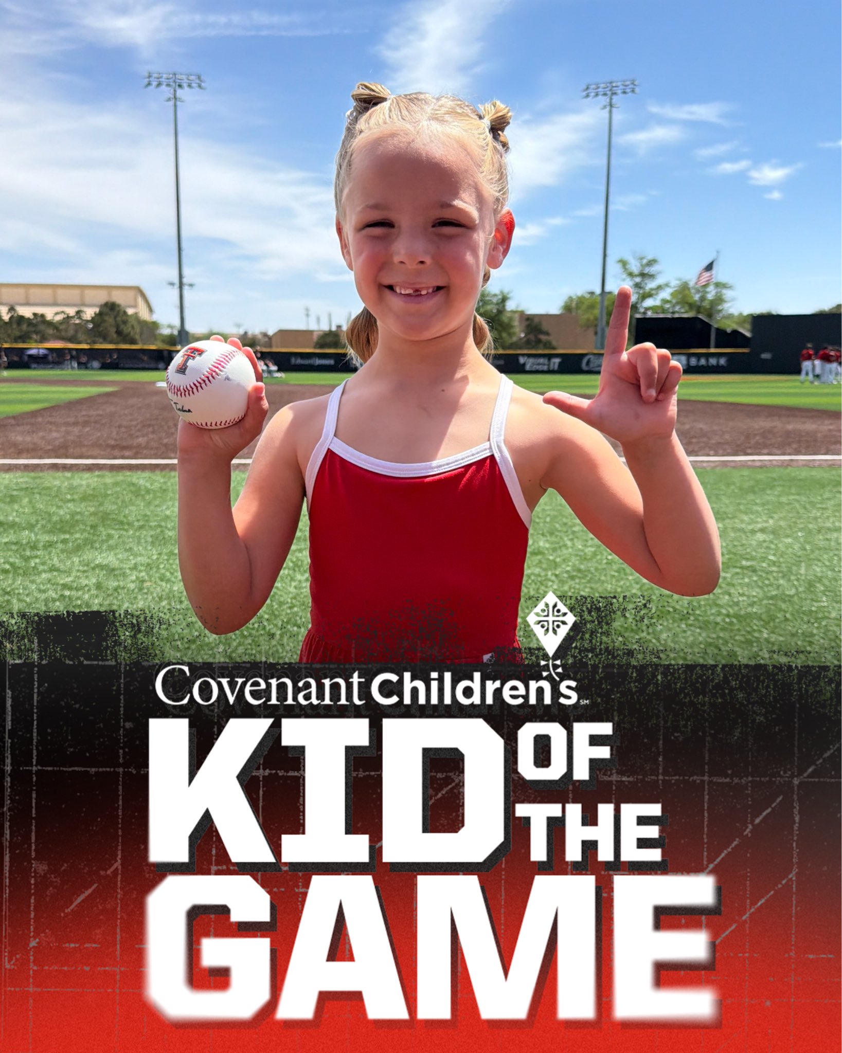 Texas Tech Red Raiders: "Welcome Kid of the Game Kennedy! She is getting us ready for first pitch!s"