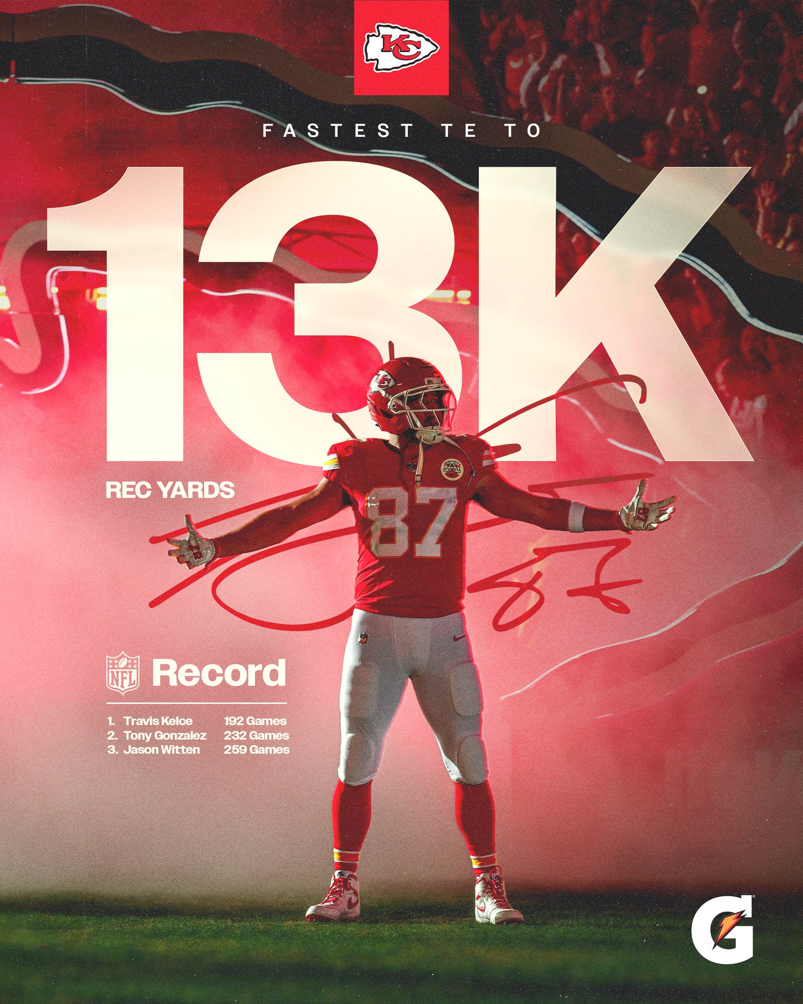 https://x.com/chiefs/status/2007954460321165324?s=46&t=724mcEBb4vaeK4o3clEpVg Kansas City Chiefs (@Chiefs) on X [https://pbs.twimg.com/media/G92vu76aYAAayFn.jpg:large] Kansas City Chiefs (@Chiefs) on X Another height reached 🏹 Congrats, @tkelce! [https://x.com/chiefs/status/2007954460321165324?s=46&t=724mcEBb4vaeK4o3clEpVg] Kelce officially has 13k receiving yards, a milestone reached in what could be his last game ever. Congrats to the legend! Let’s hope we finish this game with a W