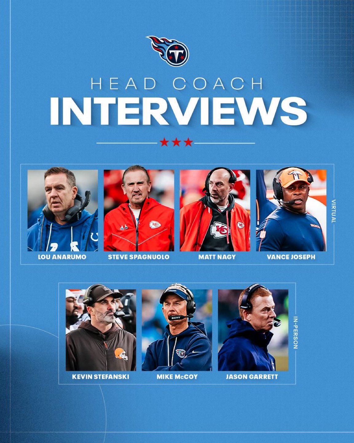 https://x.com/adamschefter/status/2010097544702112015?s=46&t=724mcEBb4vaeK4o3clEpVg Adam Schefter (@AdamSchefter) on X [https://pbs.twimg.com/media/G-VNEF7XUAAhYDH.jpg:large] Adam Schefter (@AdamSchefter) on X Here are the head coaching interviews that the Titans have conducted so far as announced by the team: [https://x.com/adamschefter/status/2010097544702112015?s=46&t=724mcEBb4vaeK4o3clEpVg] Both Steve Spagnuolo and Matt Nagy have interviewed with the Titans
